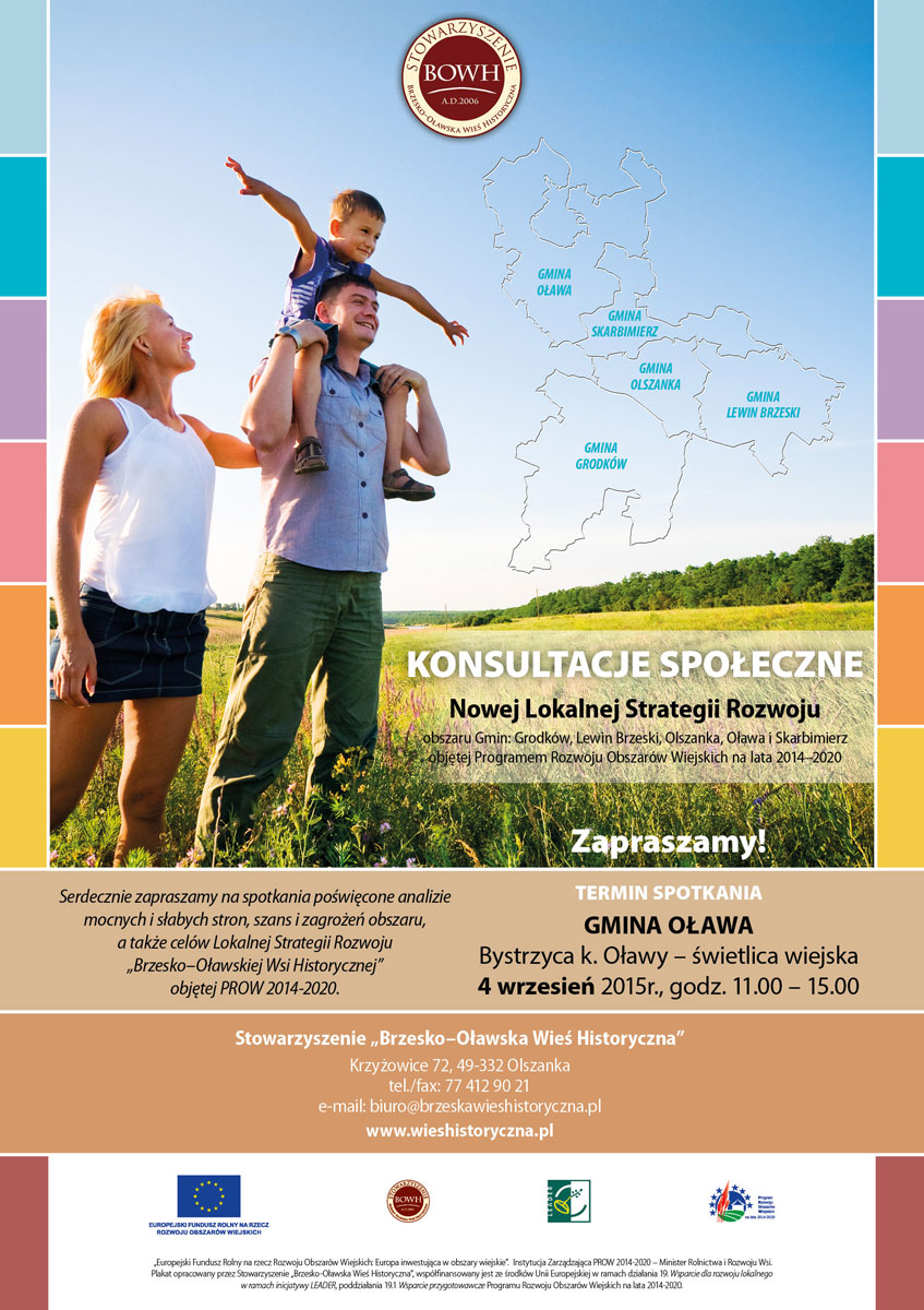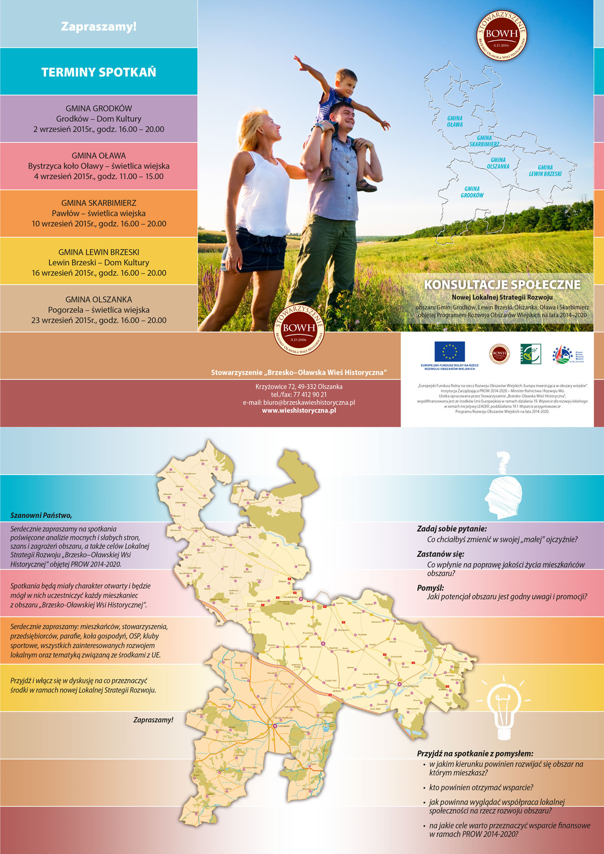 Zarząd Stowarzyszenia serdecznie zaprasza wszystkich zainteresowanych na spotkania poświęcone analizie mocnych i słabych stron, szans i zagrożeń obszaru, a także celów nowej Lokalnej Strategii Rozwoju „Brzesko-Oławskiej Wsi Historycznej” objętej PROW 2014-2020.